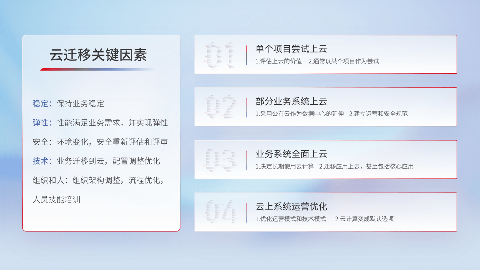 结合实际业务,,,,从规划设计、、、云平台选型、、、云原生改造、、、、数据迁移、、、、集成交付,,,,迁移全过程为客户识别最佳上云路径,,,,做好风险识别管理,,,设计网络架构、、、身份权限、、、、安全审计合规、、、操作审计、、、、日志审计、、、监控告警策略、、多站点容灾设计等,,,,对云上基础设施进行整体规划,,,,提升IT治理水平,,,以满足弹性、、、高可用、、、高性能的需求。。。
